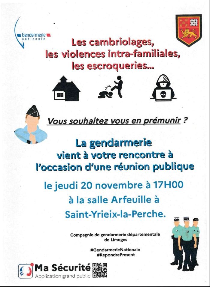 La gendarmerie vient à votre rencontre le jeudi 20 novembre 2025 à 17 h 00 à la salle Arfeuille à Saint-Yrieix-la-Perche.