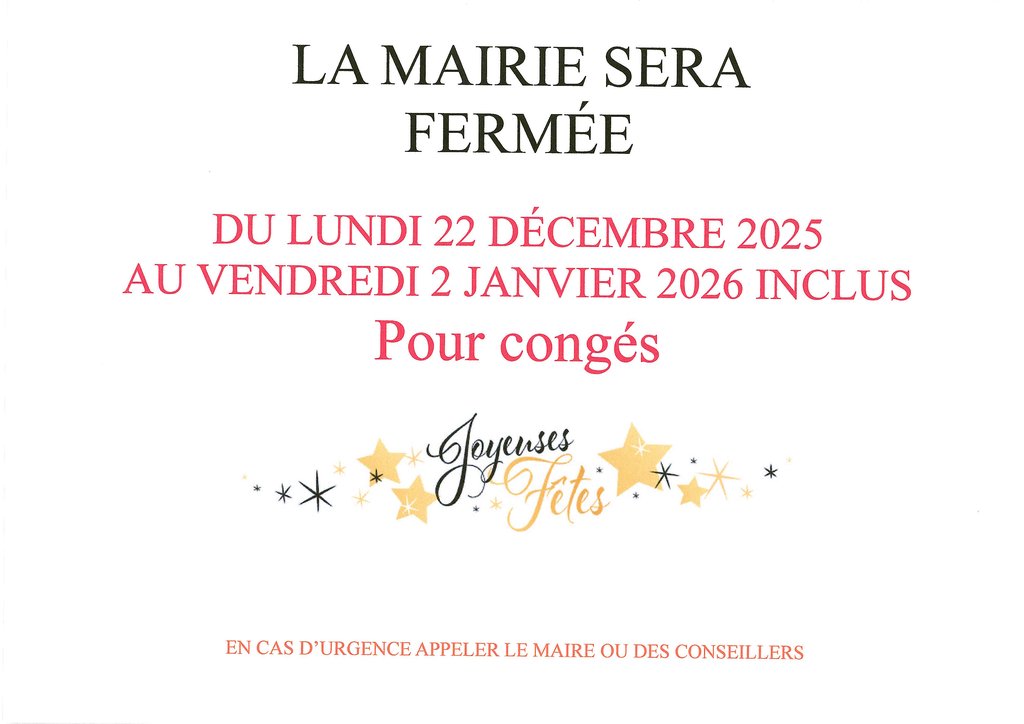 MAIRIE FERMEE DU 20.12 AU 4.01.2026