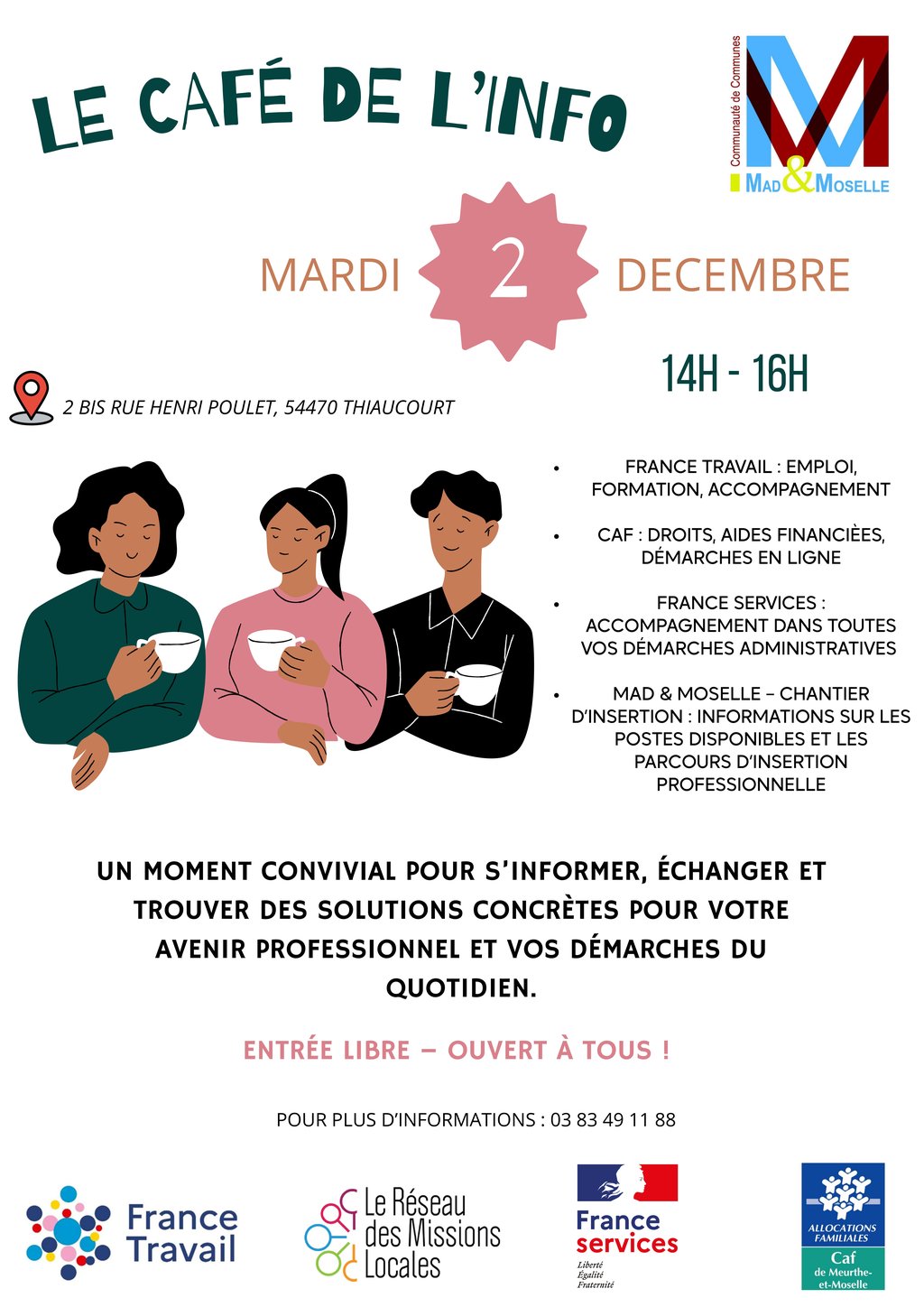Rendez-vous mardi 2 décembre, de 14h à 16h, 2 bis rue Henri Poulet à Thiaucourt-Regniéville pour un moment convivial dédié à vos démarches et votre avenir professionnel. ☕