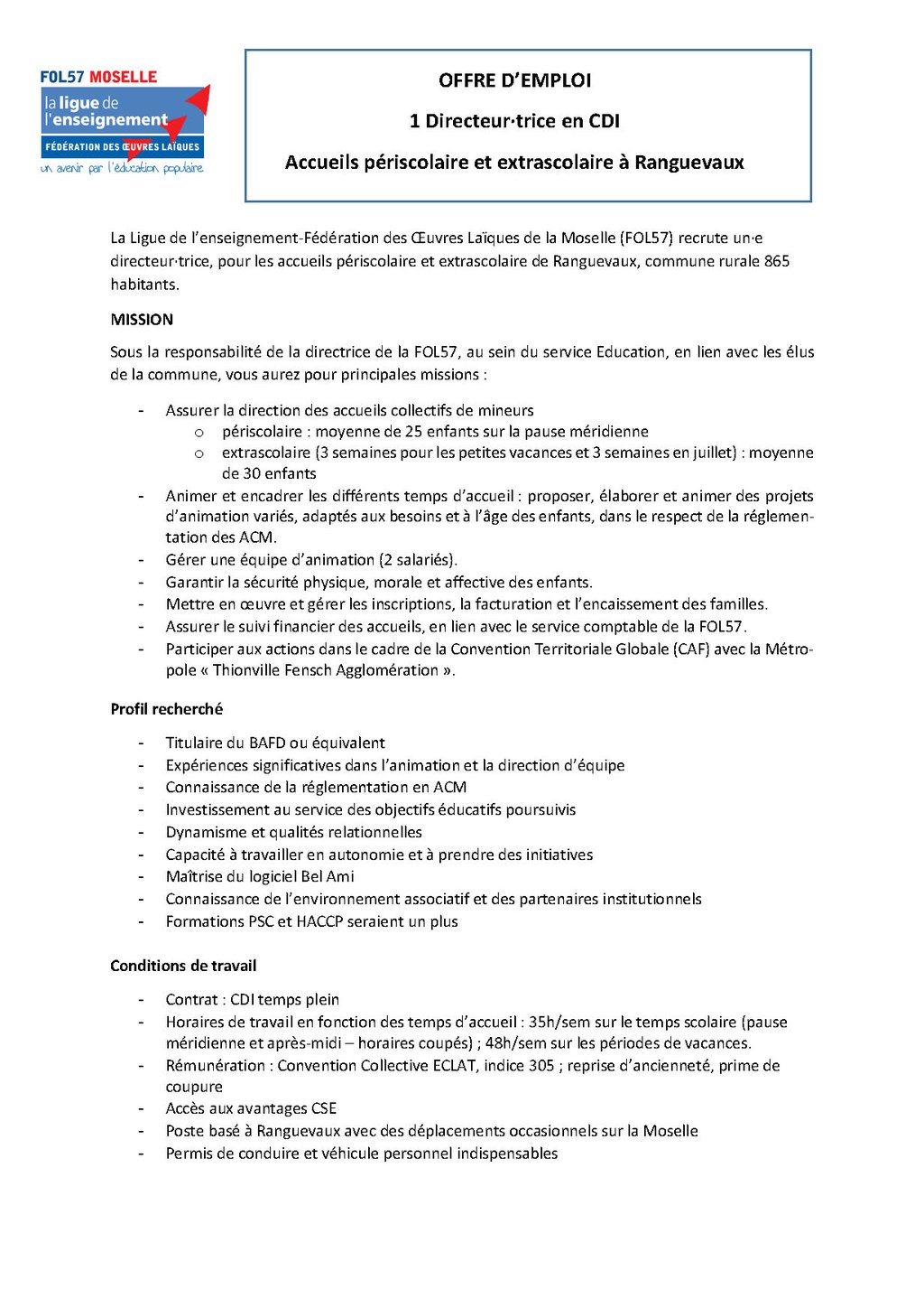 Une offre d'emploi pour un poste de Directeur·trice des accueils périscolaire et extrascolaire de Ranguevaux, gérés par la FOL57.