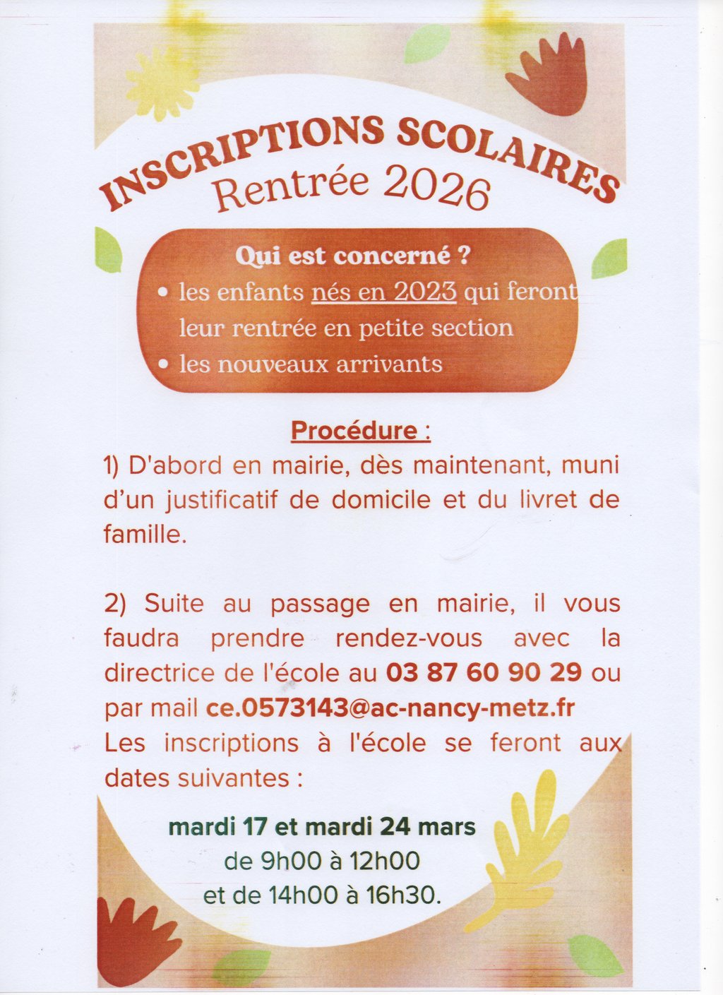 Inscriptions scolaires 2026 - 2027