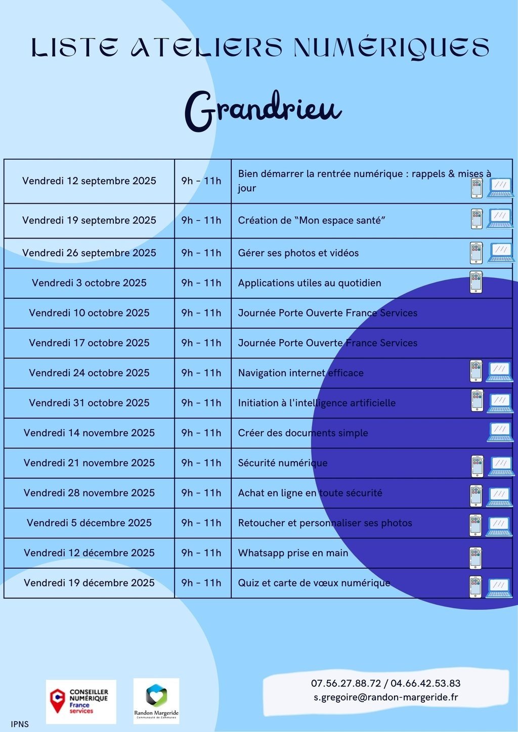 Ces ateliers auront lieu tous les vendredis de 9h à 11h à la mairie ainsi que des accompagnements individuels les vendredis après-midi. Inscription au 07.56.27.88.72 ou par mail : s.gregoire@randon-margeride.fr