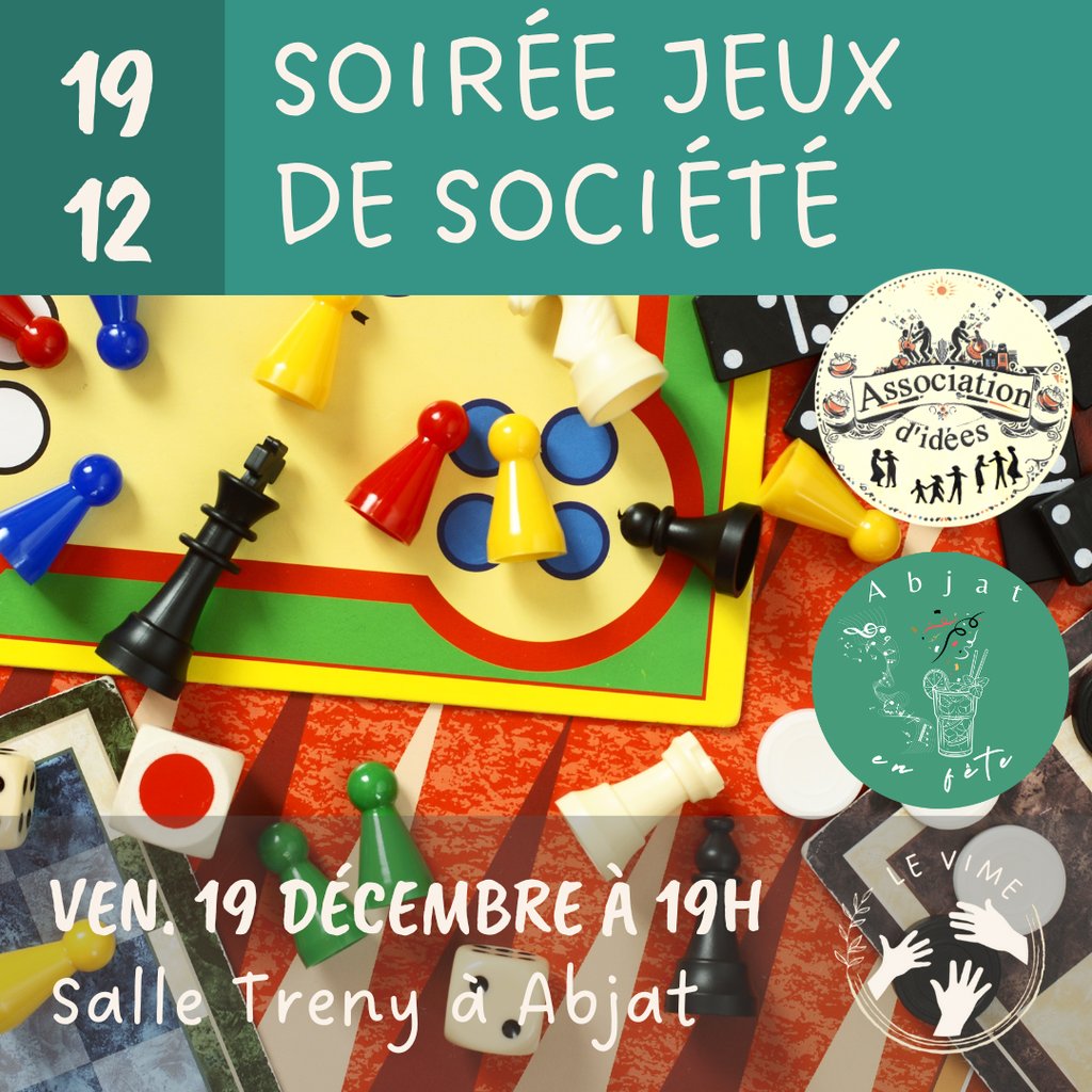 Avec Association d'IdĂ©es et Abjat en FĂȘte , venez passer une soirĂ©e conviviale, Ă  jouer Ă  vos jeux favoris, ou en dĂ©couvrir de nouveaux !