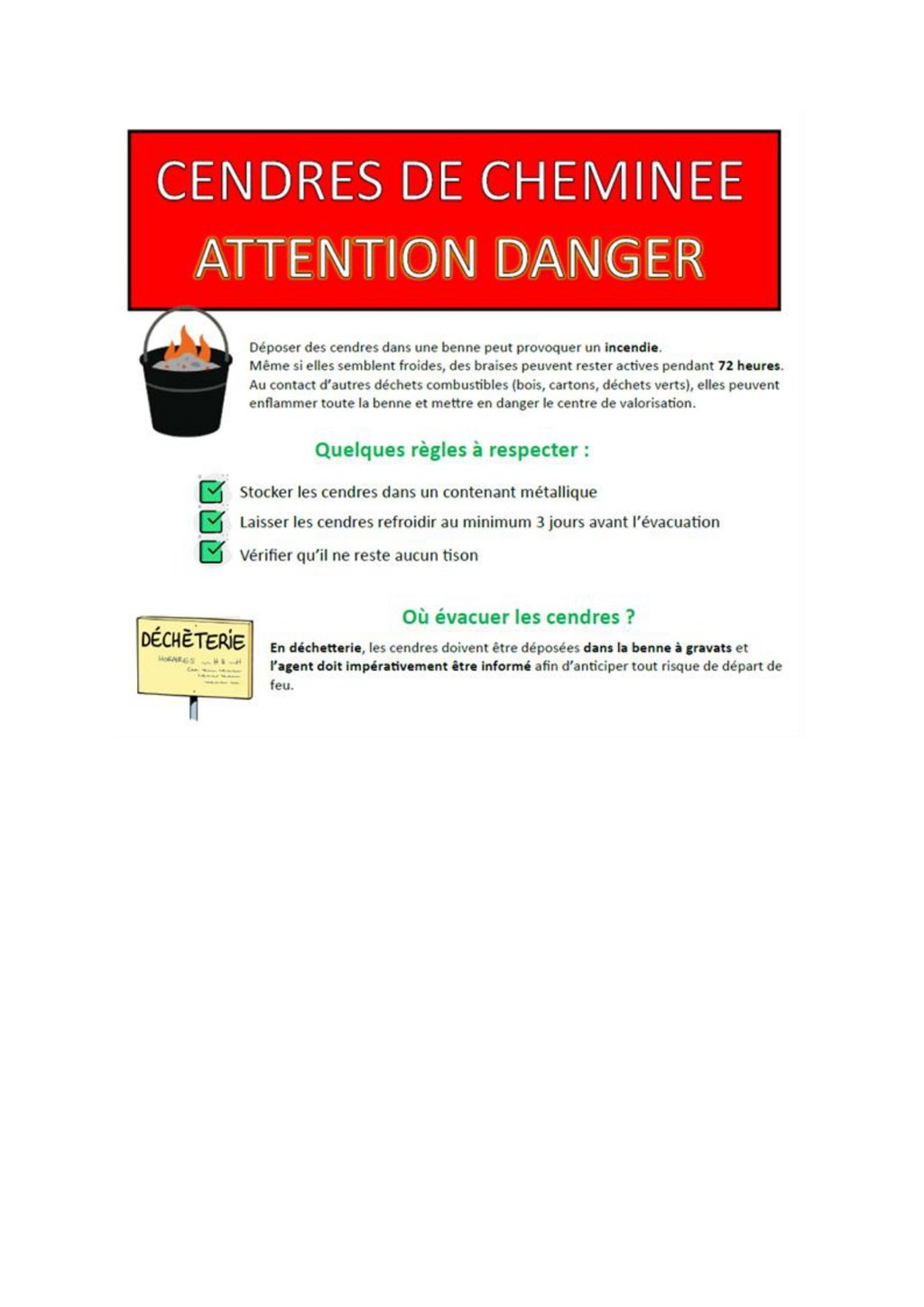 À la suite d’un incident survenu à la déchetterie de Gy-l’Évêque, il apparaît nécessaire de rappeler les règles essentielles de sécurité liées à l’évacuation des cendres :
