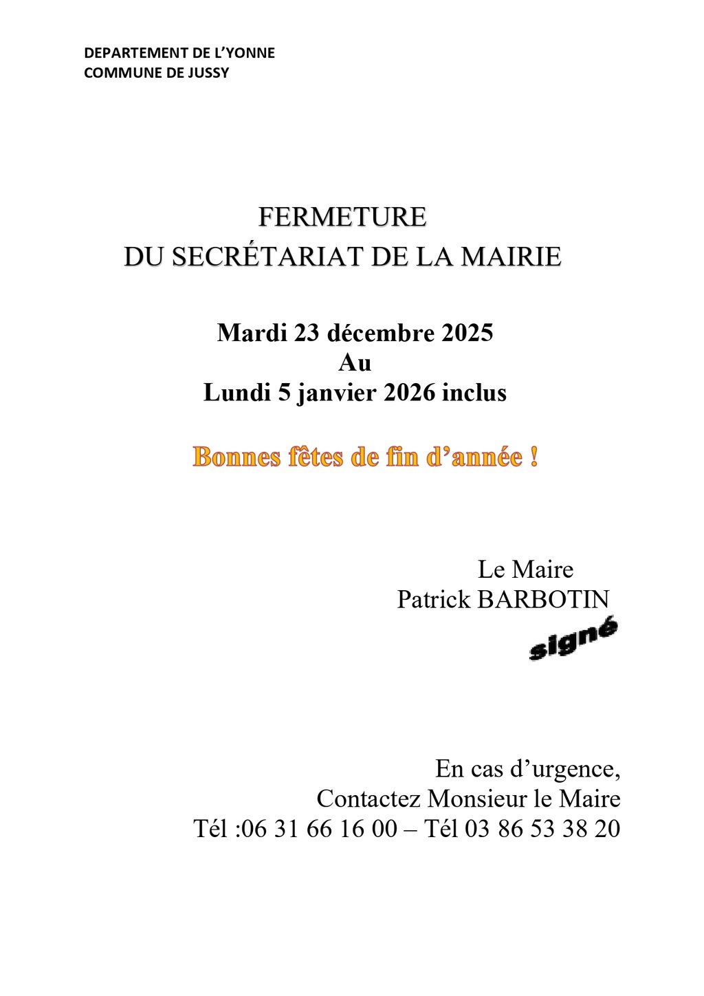 La mairie de Jussy sera fermée à l'occasion des fêtes de fin d'année du mardi 23 décembre 2025 au lundi janvier 2026 inclus.