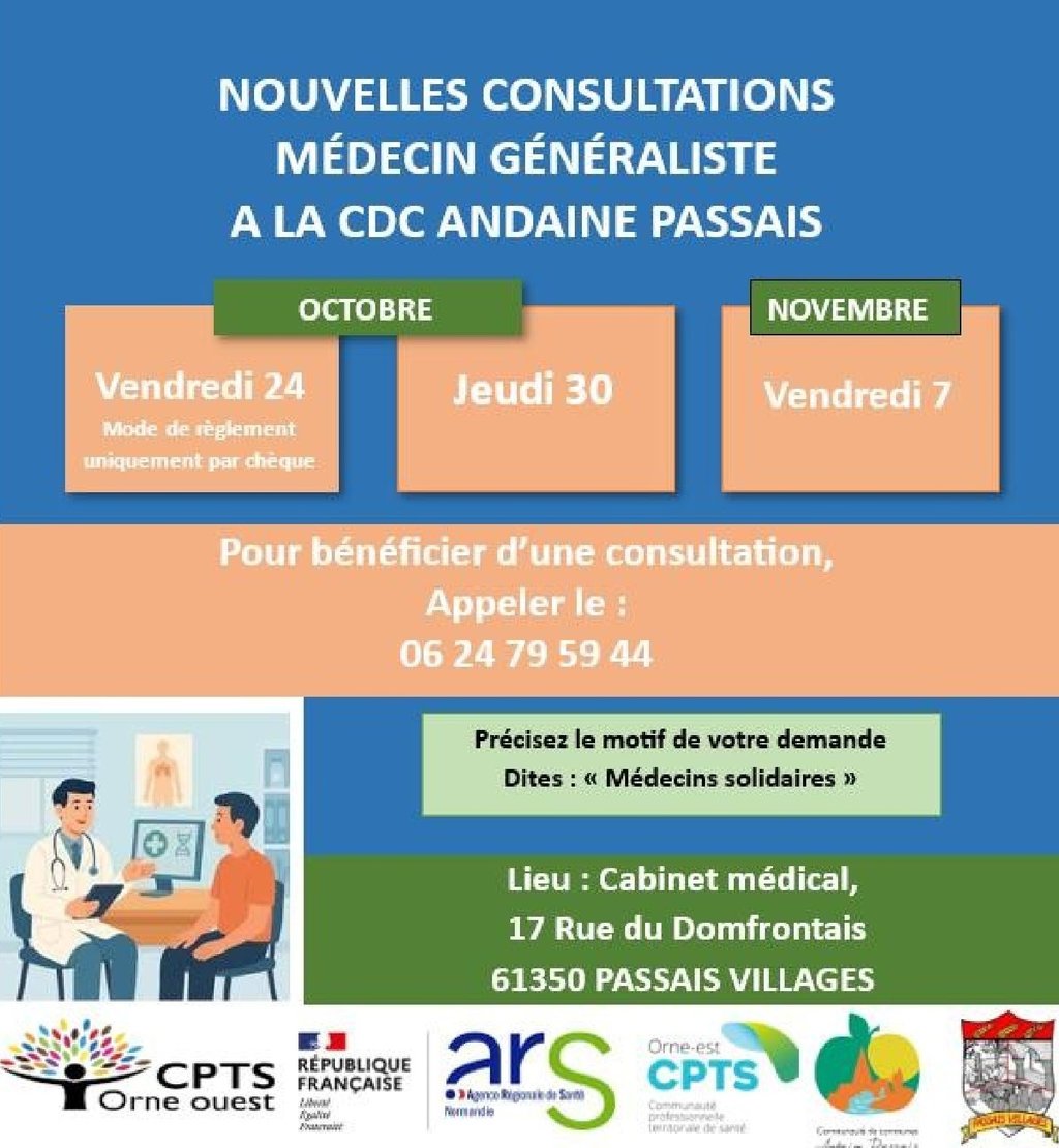 Trois nouvelles journées de consultation médecin généraliste sont prévues les vendredis 24 octobre et 7 novembre 2025 ainsi que le jeudi 30 octobre 2025 dans le cabinet médical 17 rue du Domfrontais (derrière la pharmacie) à Passais-Villages