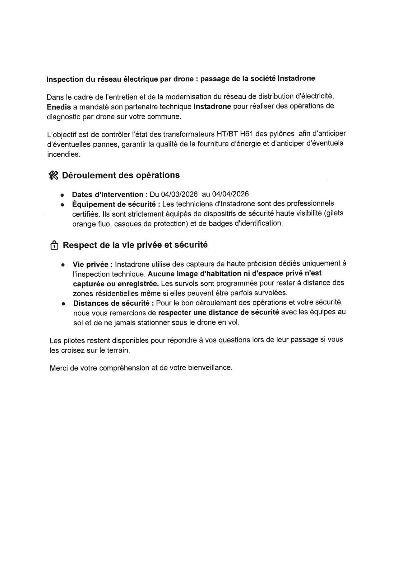 Dans le cadre de l'entretien et de la modernisation du réseau de distribution d'électricité, ENEDIS a mandaté son partenaire technique Instadrone pour réaliser des opérations de diagnostic par drone sur Juvigny Val d'Andaine.