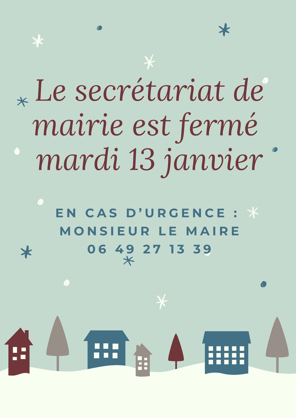 Le secrétariat de mairie sera fermé mardi 13 janvier