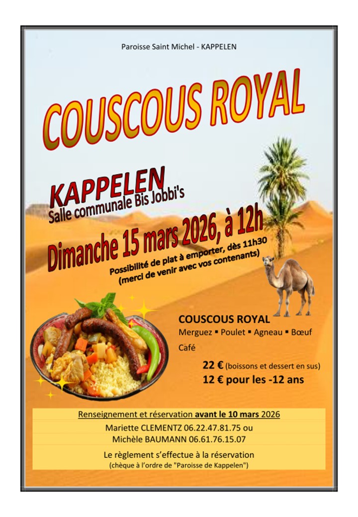 Le Conseil de Fabrique organise un repas "Couscous royal", dimanche 15 mars à la salle communale.