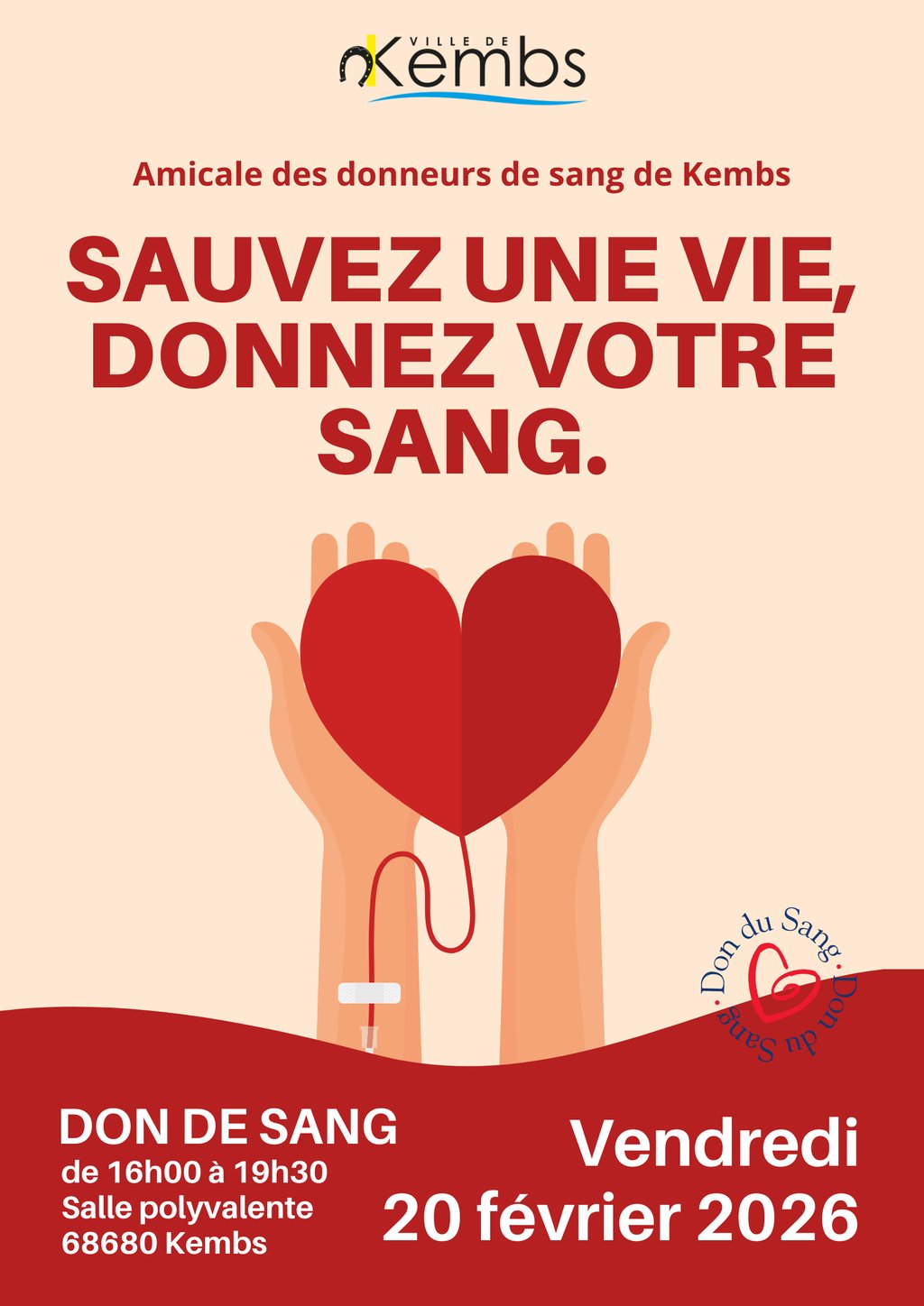L'amicale des donneurs de sang vous invite à la collecte du vendredi 20 février 2026 à la salle polyvalente de Kembs de 16h à 19h30.