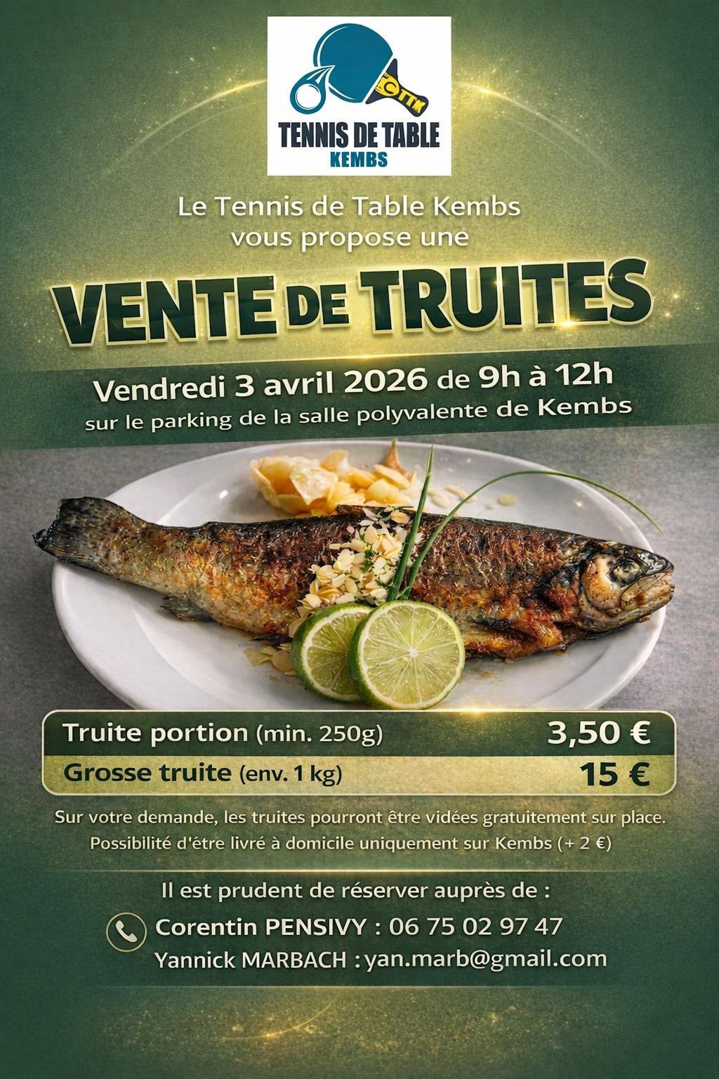 Comme le veut la tradition (et parce que c’est surtout très bon), le Vendredi Saint est LE jour parfait pour savourer du poisson. En famille, entre amis, entre voisins... ou en tête-à-tête avec une bonne truite. Le Tennis de Table de Kembs vous propose des truites ultra-fraîches – si fraîches qu’elles pourraient presque nager jusqu’à votre assiette !