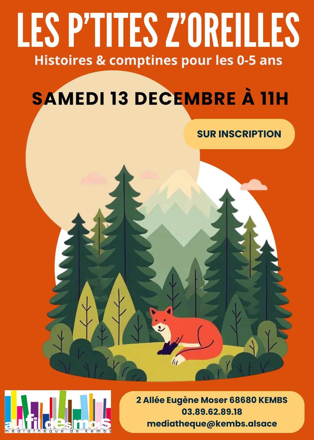 La Médiathèque vous donne rendez-vous samedi 13 décembre à 11h00 à l'espace contes pour la séance des p'tites z'oreilles.