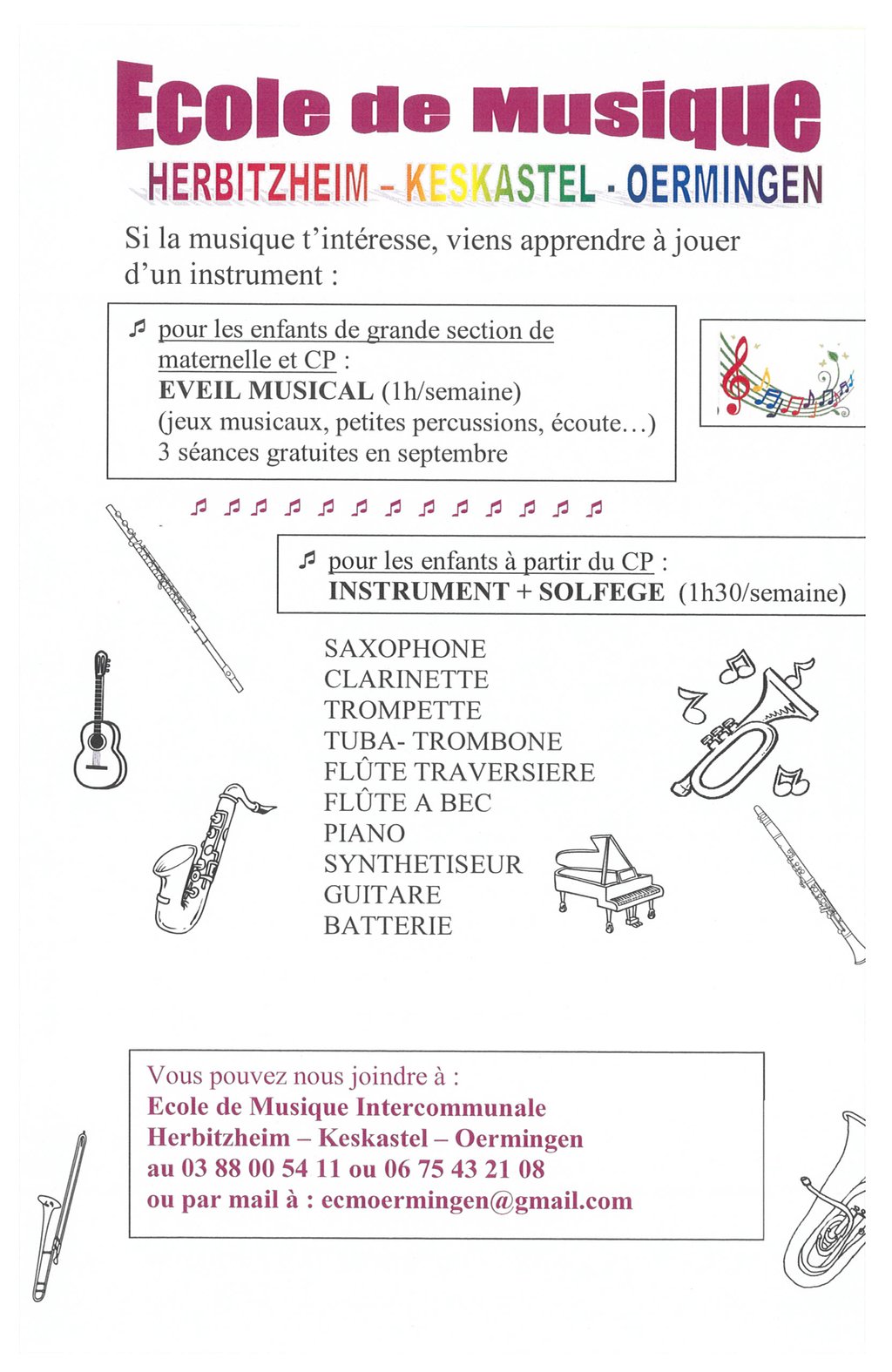Si vos enfants souhaitent connaître l'apprentissage ou la découverte d'un instrument, n'hésitez pas à prendre contact avec l'école de musique intercommunale au 03.88.00.54.11 ou au 06.75.43.21.08 ou par e-mail à ecmoermingen@gmail.com