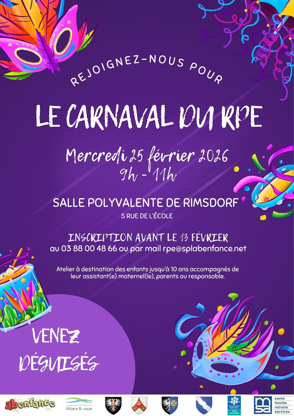 Le carnaval du Relais petite enfance d'Alsace bossue aura lieu le mercredi 25 février 2026 de 9h à 11h à la salle polyvalente de Rimsdorf.