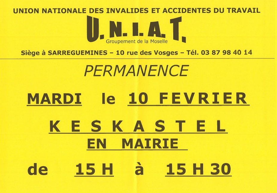 Une permanence de l'Union Nationale des Invalides et Accidentés du Travail aura lieu le mardi 10 février à la mairie de Keskastel de 15h à 15h30.