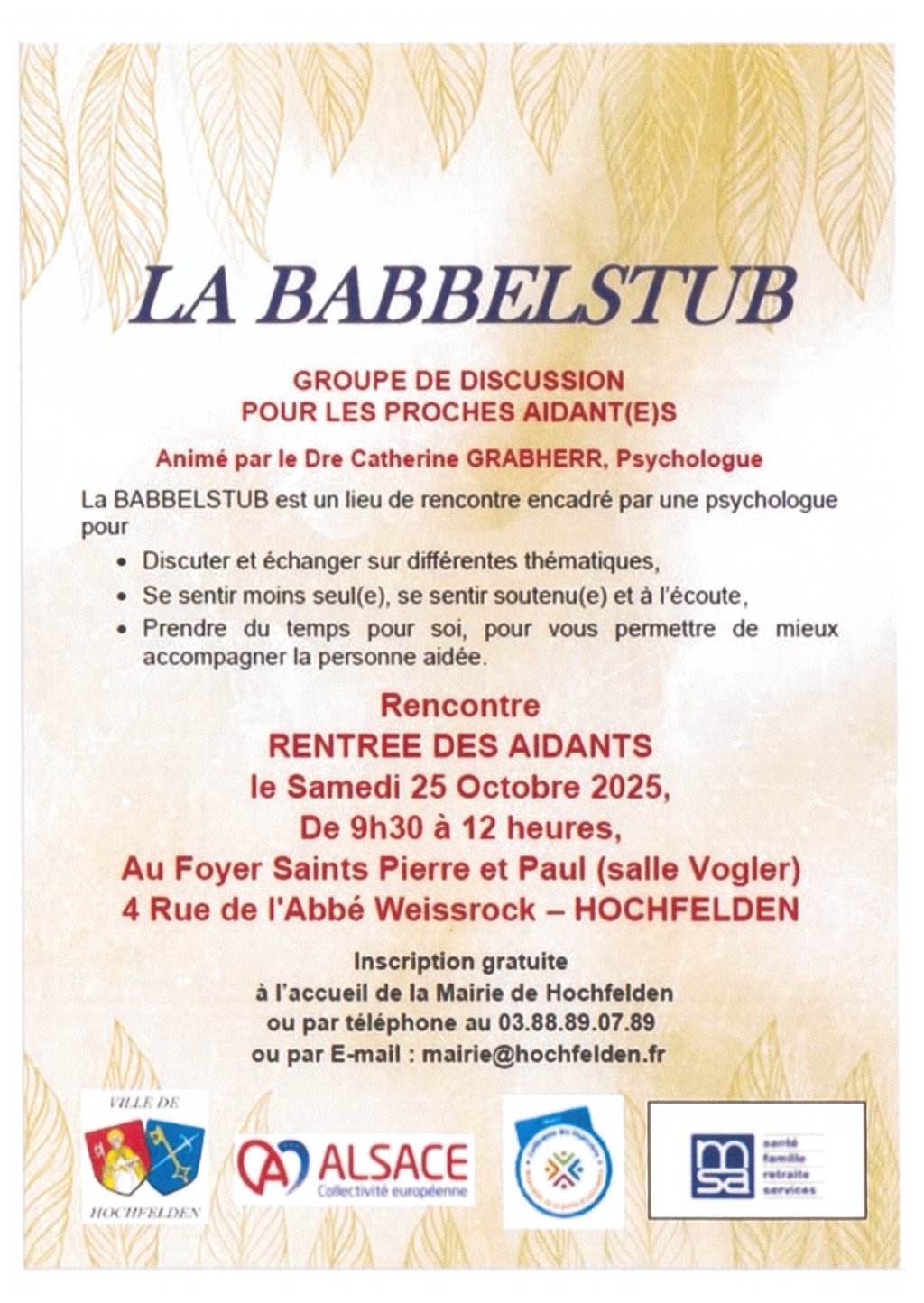 Vous trouverez en pièce jointe la prochaine rencontre "Rentrée des aidants" qui aura lieu le samedi 25 octobre 2025 de 9h30 à 12h00