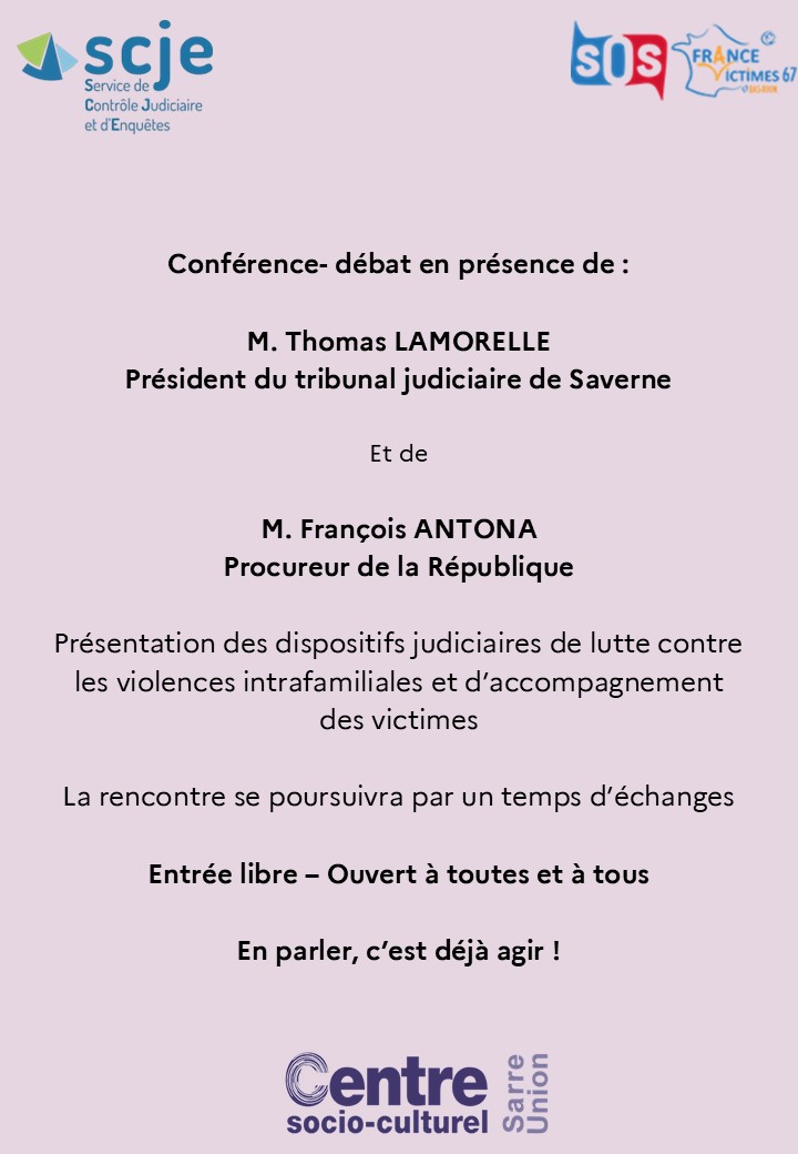 Dans le cadre de la journée internationale de lutte contre les violences faites aux femmes, une conférence-débat organisée par le tribunal judiciaire de SAVERNE le mardi 25 novembre 2025 à 18h00 au Centre socioculturel de SARRE-UNION et qui sera animée par le président du tribunal judiciaire, M. LAMORELLE et le procureur de la République, M. ANTONA.