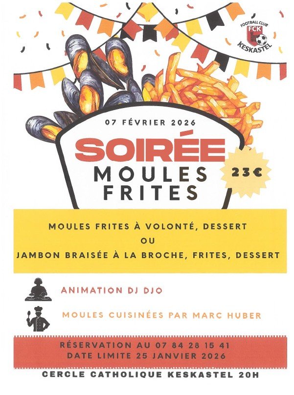 Le Football Club de KESKASTEL organise une soirée moules frites le 07 février 2026.