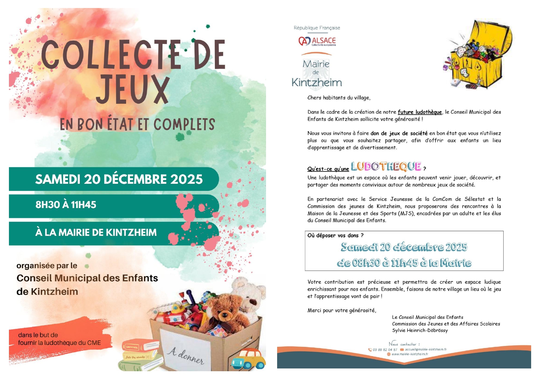 Pour créer la future ludothèque de Kintzheim, le Conseil Municipal des Enfants fait appel à votre générosité !