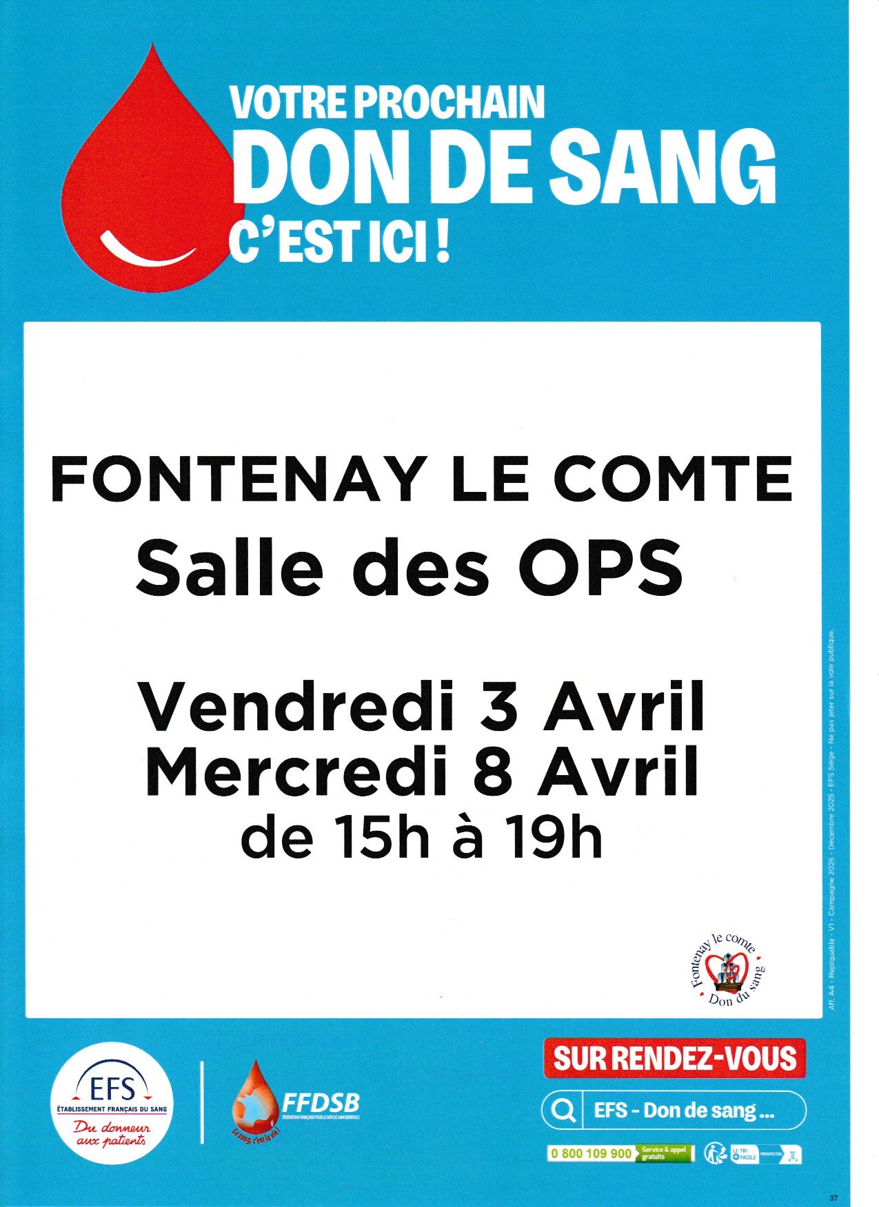 Une collecte de don du sang est organisée les 3 et 8 avril 2026 à la salle des OPS de Fontenay le Comte.