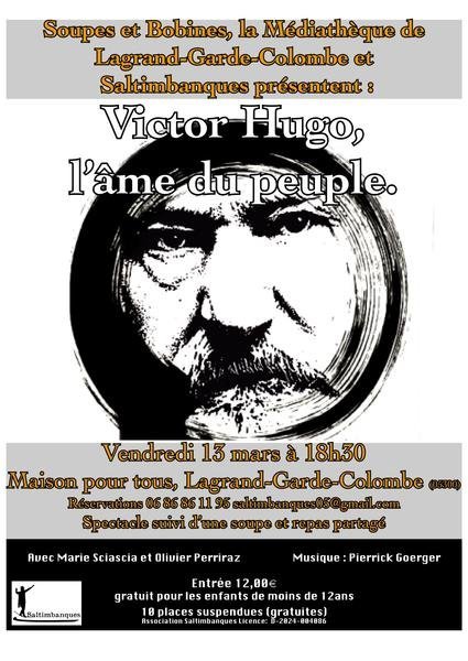Textes choisis de Victor Hugo. Avec Marie Sciascia et Olivier Perriraz; musique de Pierrick Goerger. Spectacle suivi d'une soupe et repas partagé.