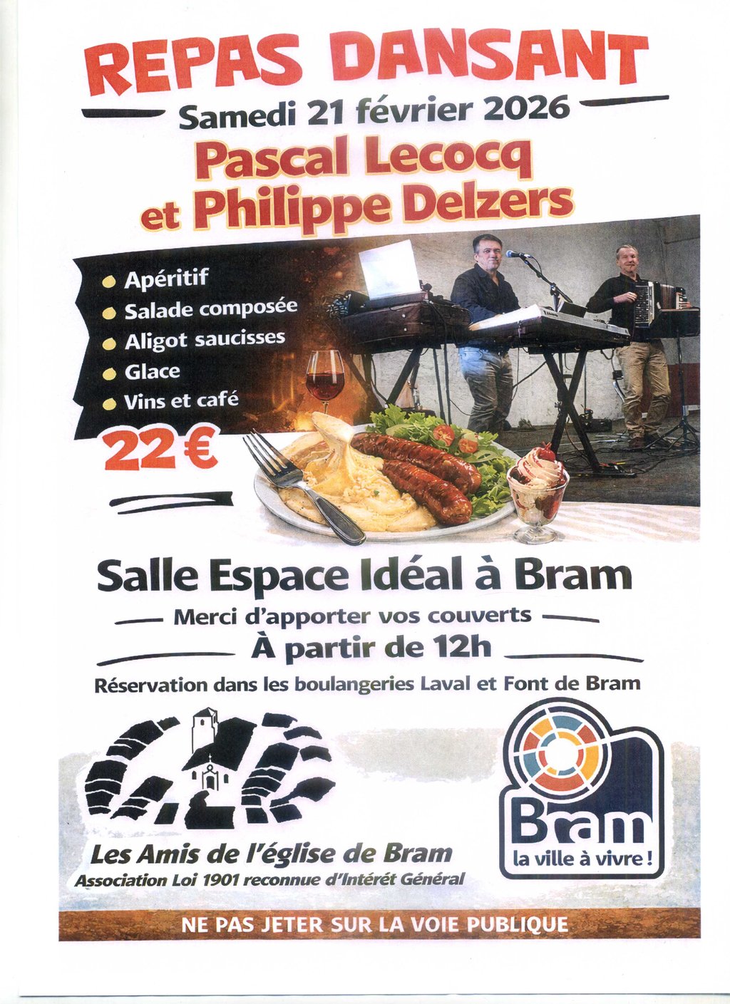 Comme tous les ans à la même époque, les Amis de l'église de Bram vous invitent à un Repas Dansant autour d'un aligot de l'Aveyron orchestré par Laurent SPANGHERO et saucisse grillée au feu de bois à la façon de Raymond GARCIA.