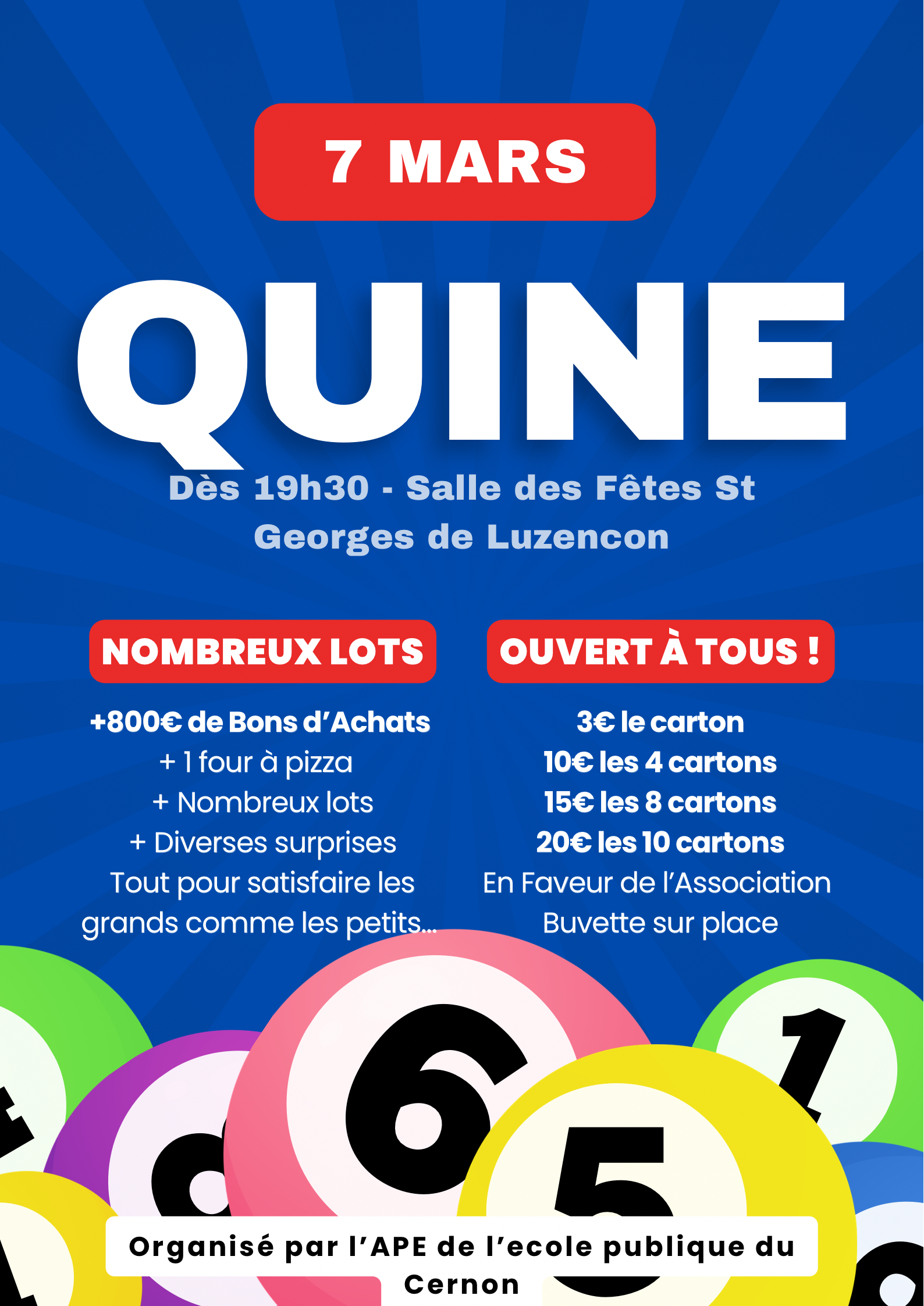 L’APE de l’école publique du cernon a le plaisir de vous inviter à son quine!