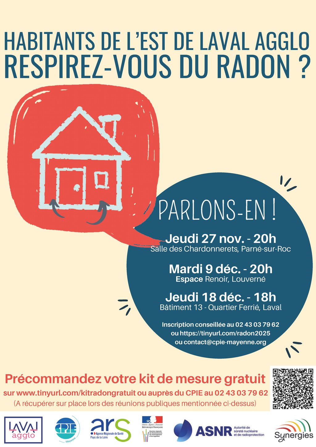 3 réunions se préparent afin d’informer et distribuer un kit gratuit pour mesurer le radon dans les logements des particuliers (inscription facultative mais recommandée auprès du CPIE Mayenne au 02 43 03 79 62 ou via ce formulaire ( www.tinyurl.com/reunions2024) :