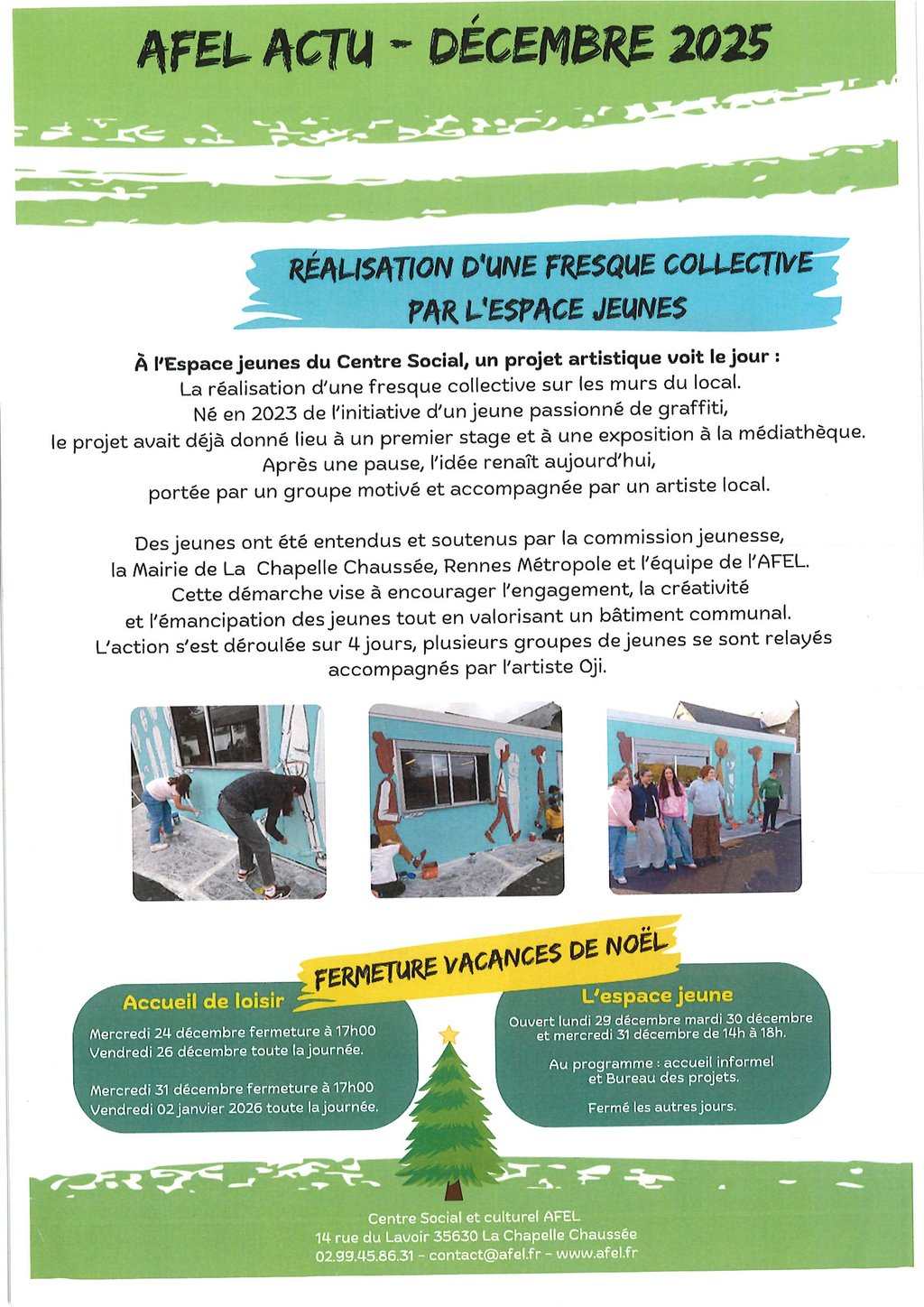 🎨 Réalisation d’une fresque collective – Espace Jeunes : un projet artistique mené par les jeunes et accompagné par un artiste local. 4 jours d’action, avec plusieurs groupes de jeunes.