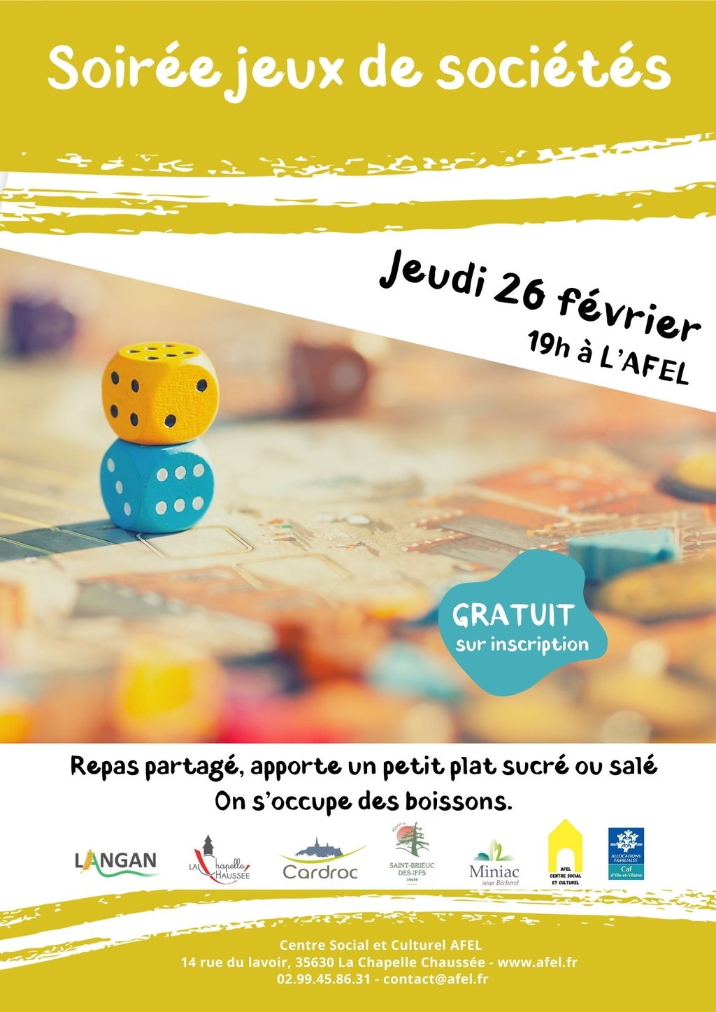 Jeudi 26 février : Soirée jeux de sociétés - Repas partagé, apporte un petit plat sucré ou sale - 19h à l'AFEL
