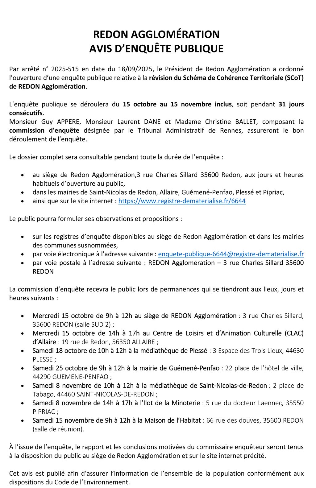 Redon Agglomération ouvre l'enquête publique concernant la révision du schéma de cohérence territorial.