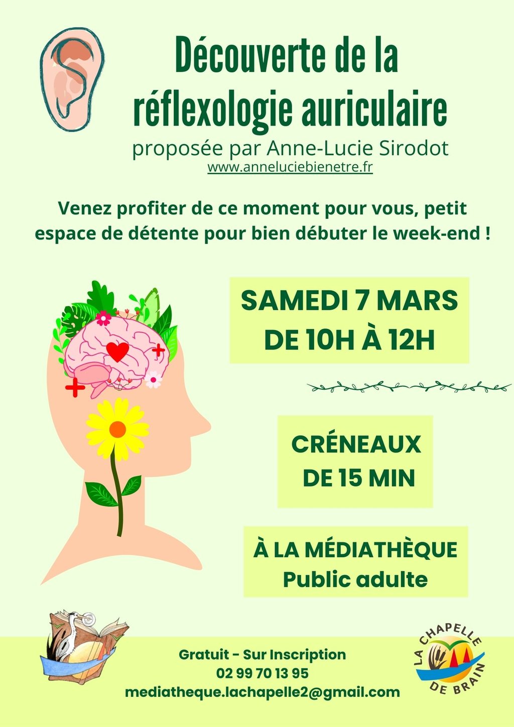 La médiathèque vous propose le Samedi 7 mars de réserver un créneau de 15 min, entre 10h et 12h pour découvrir la pratique de la réflexologie auriculaire.