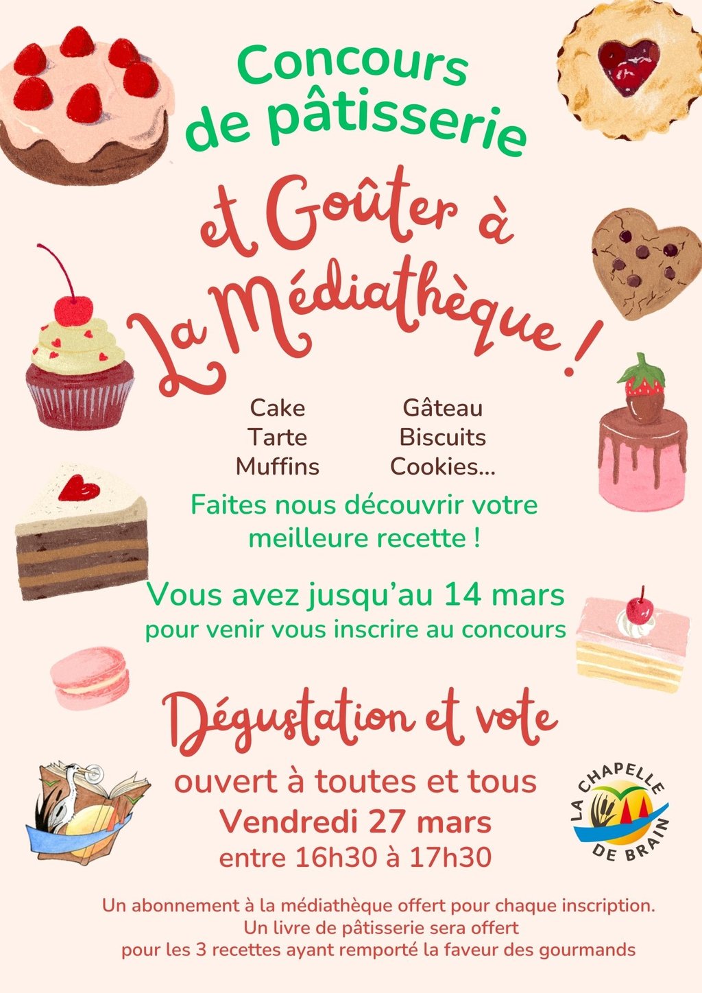 Un abonnement à la médiathèque sera offert pour chaque inscription au concours. Un livre de pâtisserie sera offert pour les 3 recettes ayant remporté la faveur des gourmands.