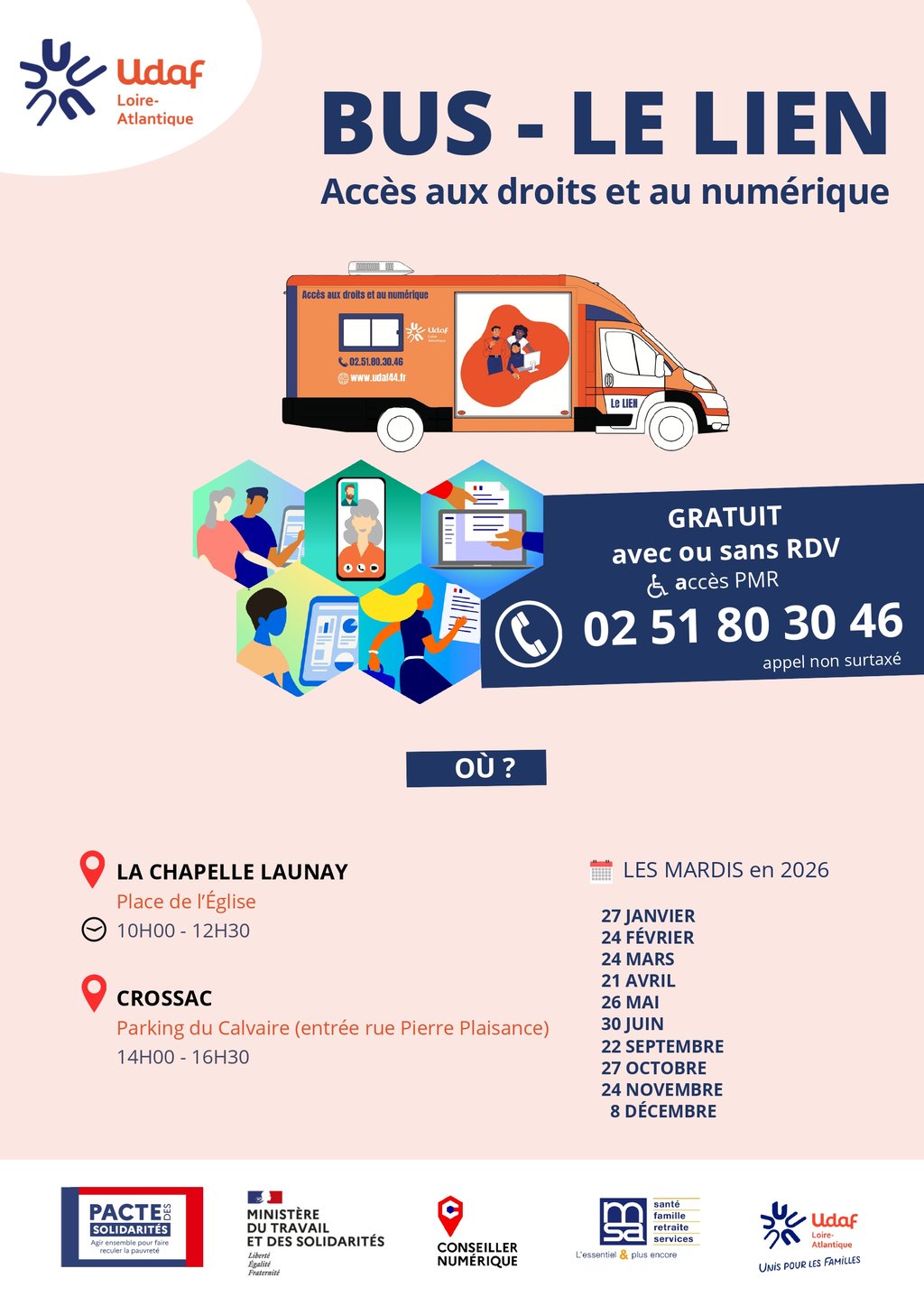 Les services proposés permettent de favoriser l’accès aux droits, de lutter contre la fracture numérique et les problèmes de mobilité en milieu rural. Le bus Le LIEN dispose d’une ligne téléphonique dédiée : vous pourrez ainsi prendre rendez-vous ou demander de l’information en dehors des jours de présence.