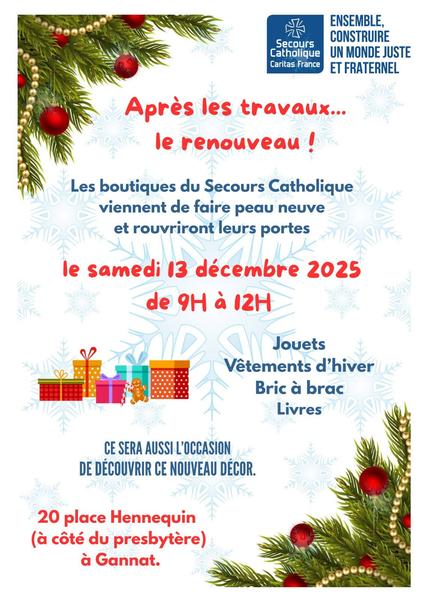 Réouverture des boutiques du Secours Catholique à Gannat ! Après travaux, découvrez le nouveau décor et faites de bonnes affaires solidaires. Jouets, vêtements d'hiver, bric-à-brac, livres... Venez chiner tout en soutenant une belle cause humanitaire !
