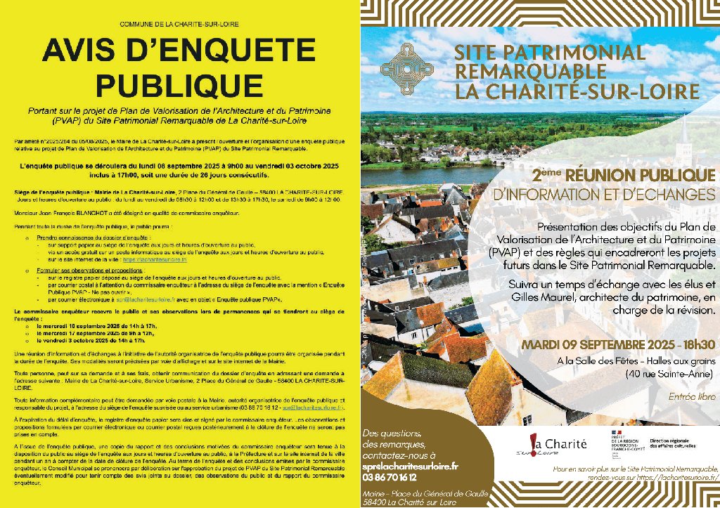 📢 Du 08 septembre au 03 octobre 2025, participez à l’enquête publique relative à l’élaboration du Plan de Valorisation de l’Architecture et du Patrimoine (PVAP) du Site Patrimonial Remarquable de La Charité-sur-Loire.