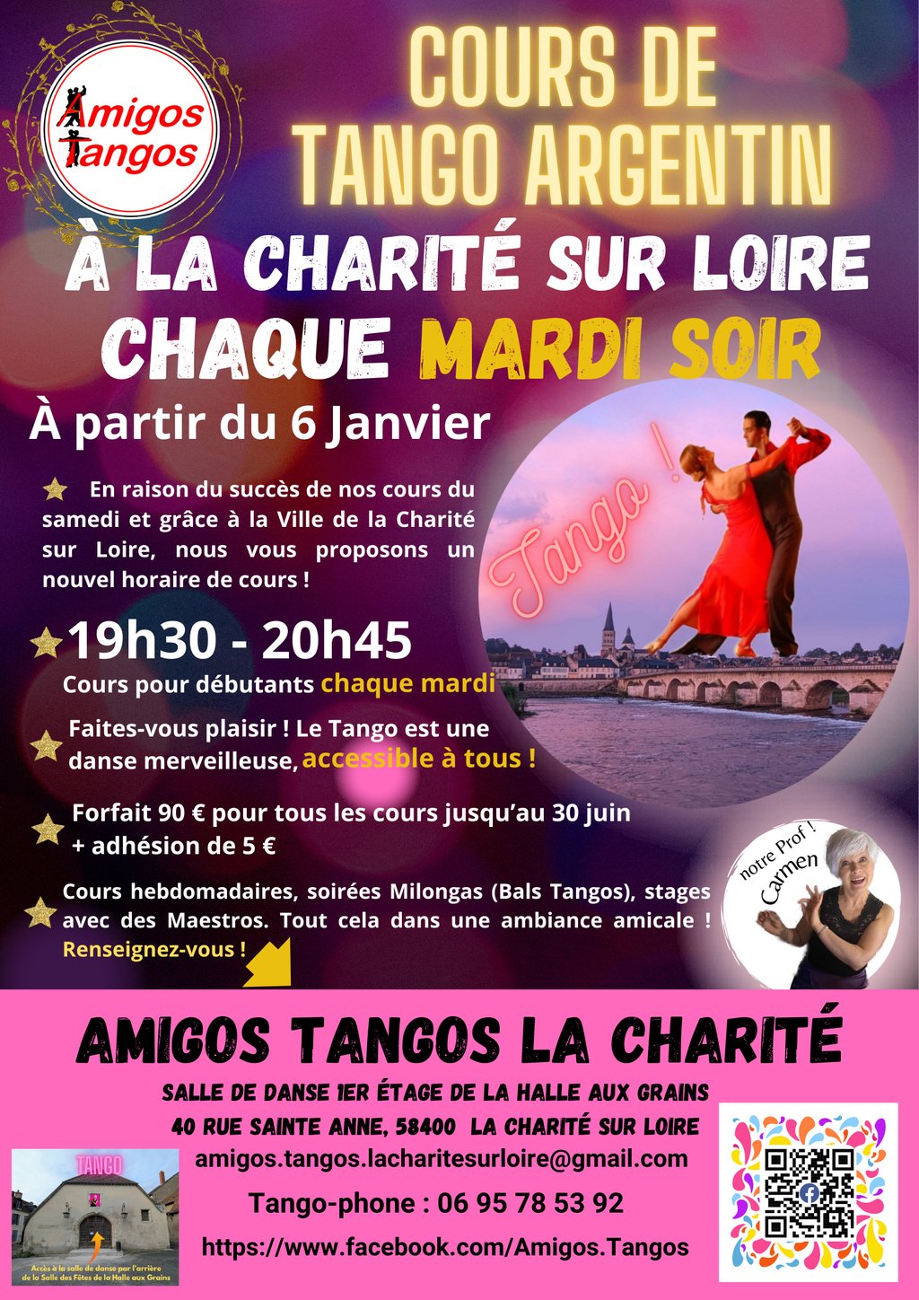 En raison du succès de ses cours du samedi, l'association Amigos Tangos a le grand plaisir de vous annoncer qu'elle proposera à partir du 6 janvier 2026 un cours supplémentaire de Tango Argentin pour débutants chaque mardi soir de 19h30 à 20h45 !