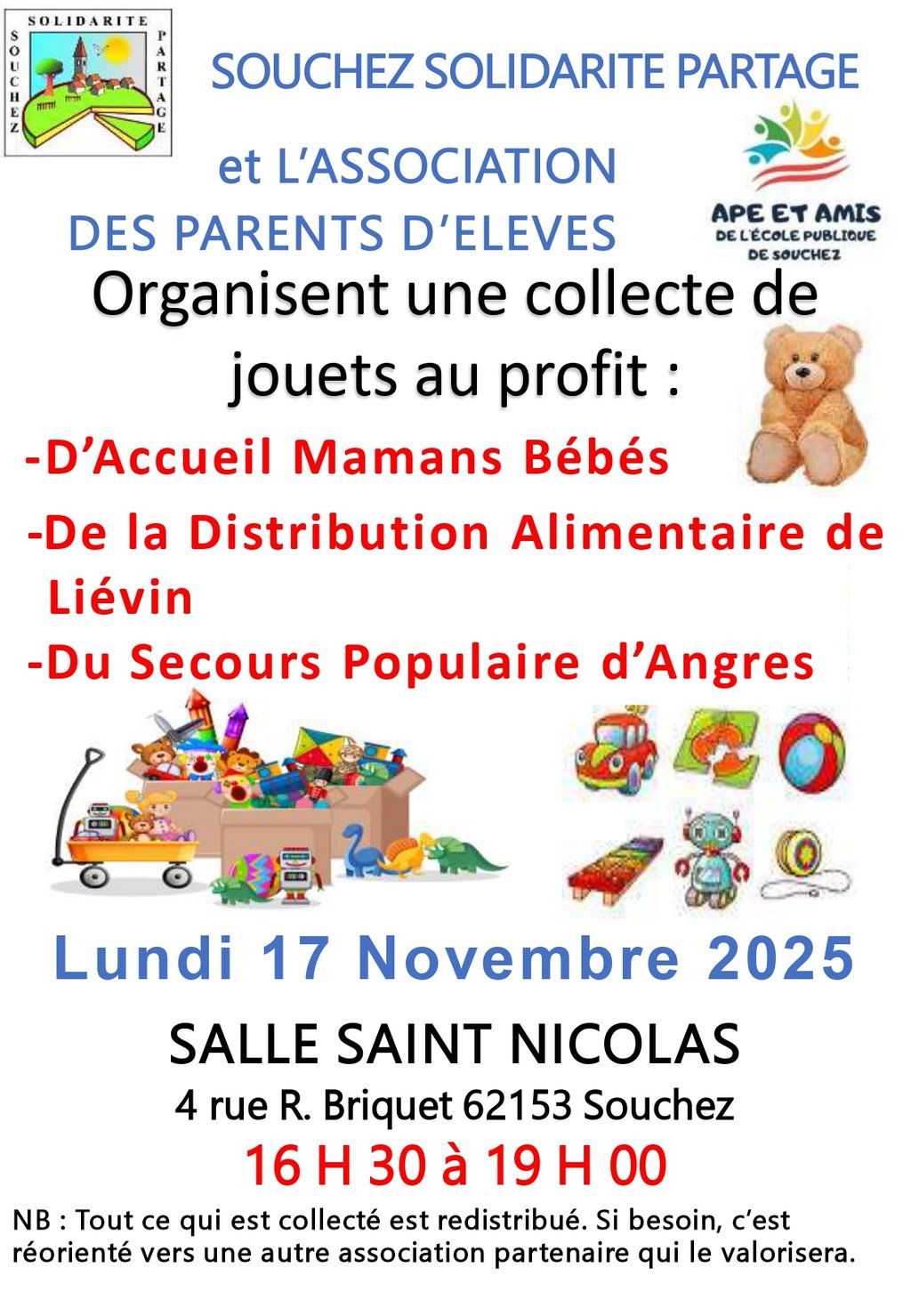 Collecte de jouets au bénéfice d'associations locales qui les offrent aux enfants défavorisés.
