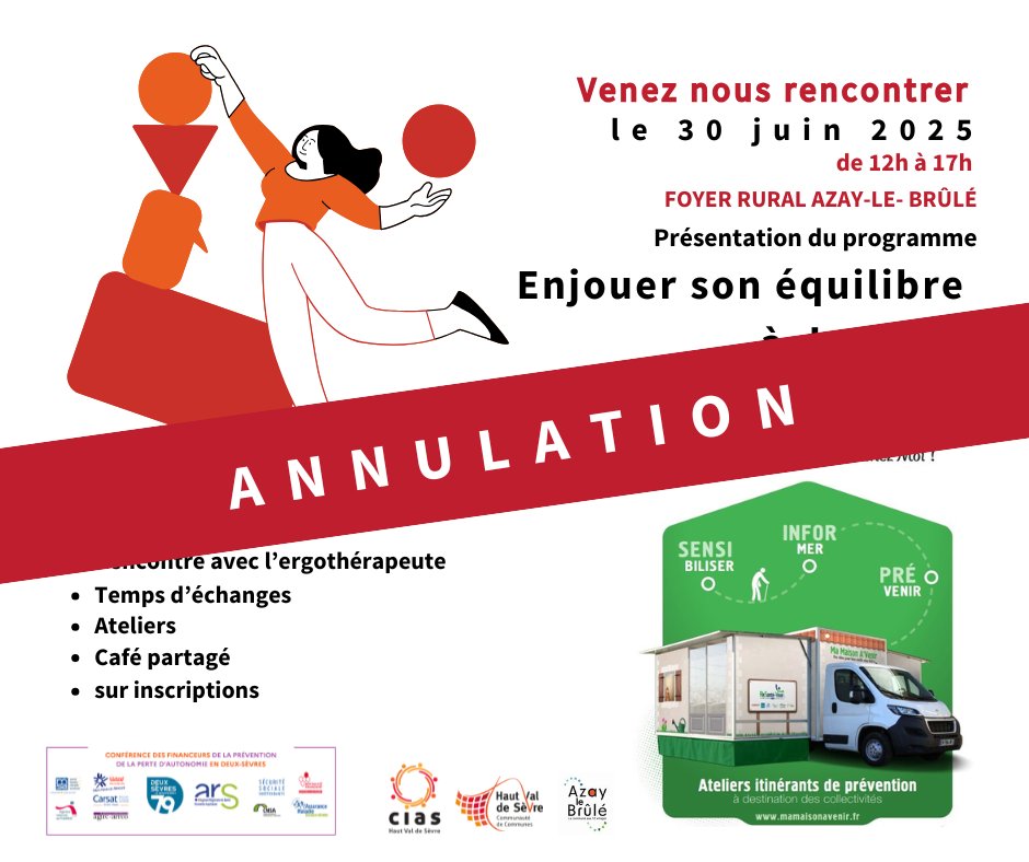 En raison de la canicule et pour garantir la sécurité de tous, la présentation du programme « Enjouer son équilibre à domicile », prévue ce lundi 30 juin de 12h à 17h au Foyer rural de Cerzeau (Azay-Le-Brûlé), est annulée.