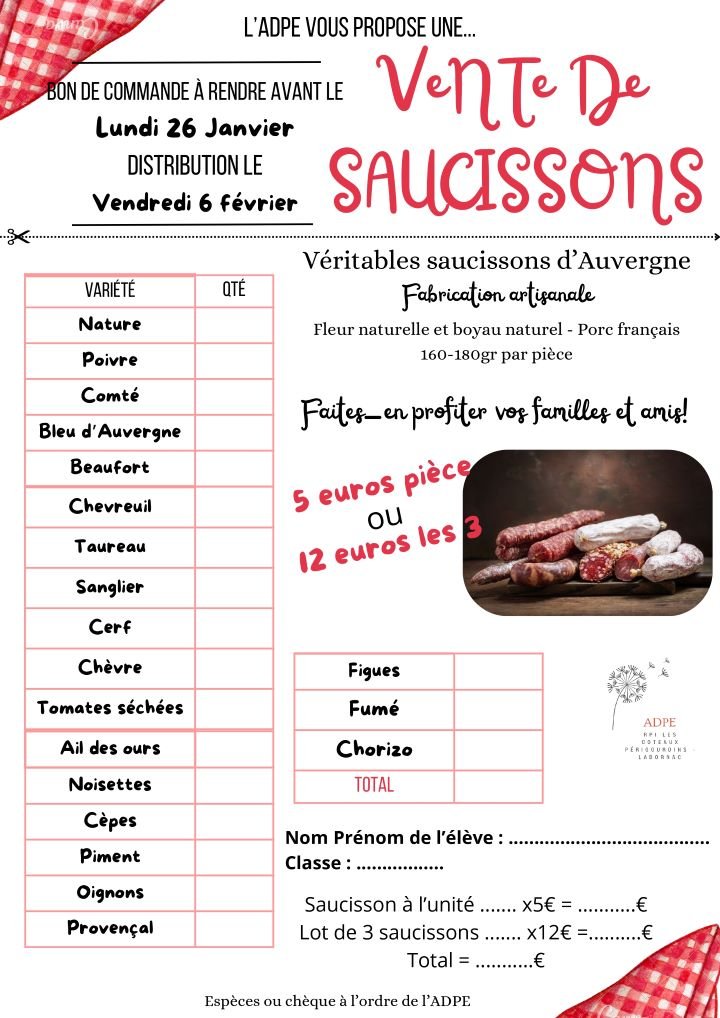 L'ADPE VOUS PROPOSE : VENTE DE SAUCISSONS