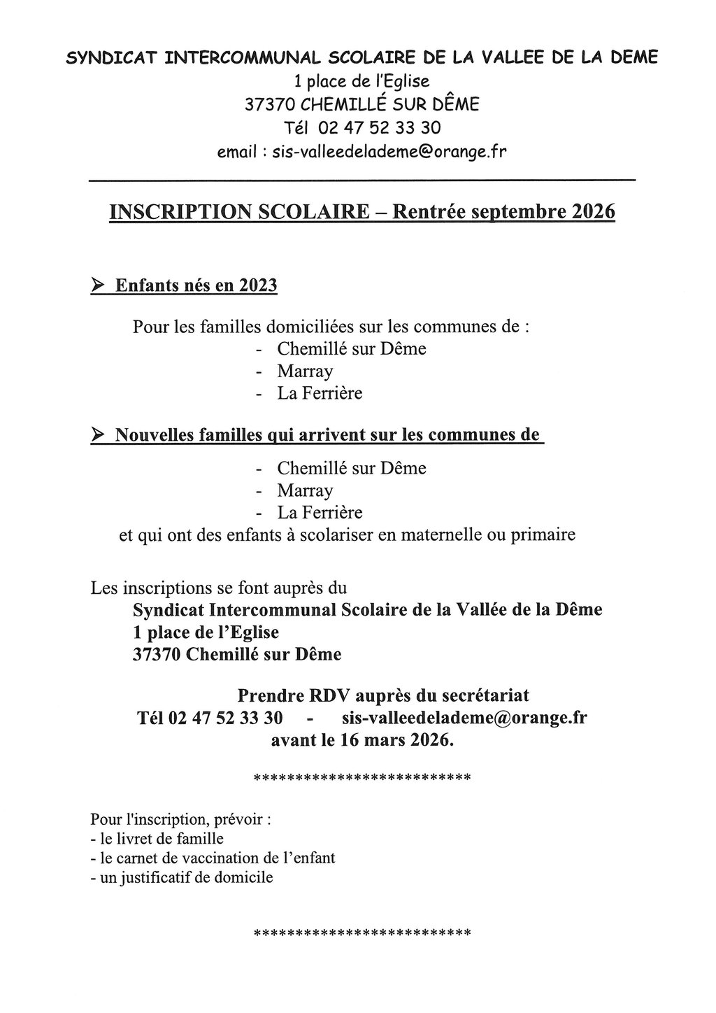 INSCRIPTION SCOLAIRE - RENTREE SEPTEMBRE 2026