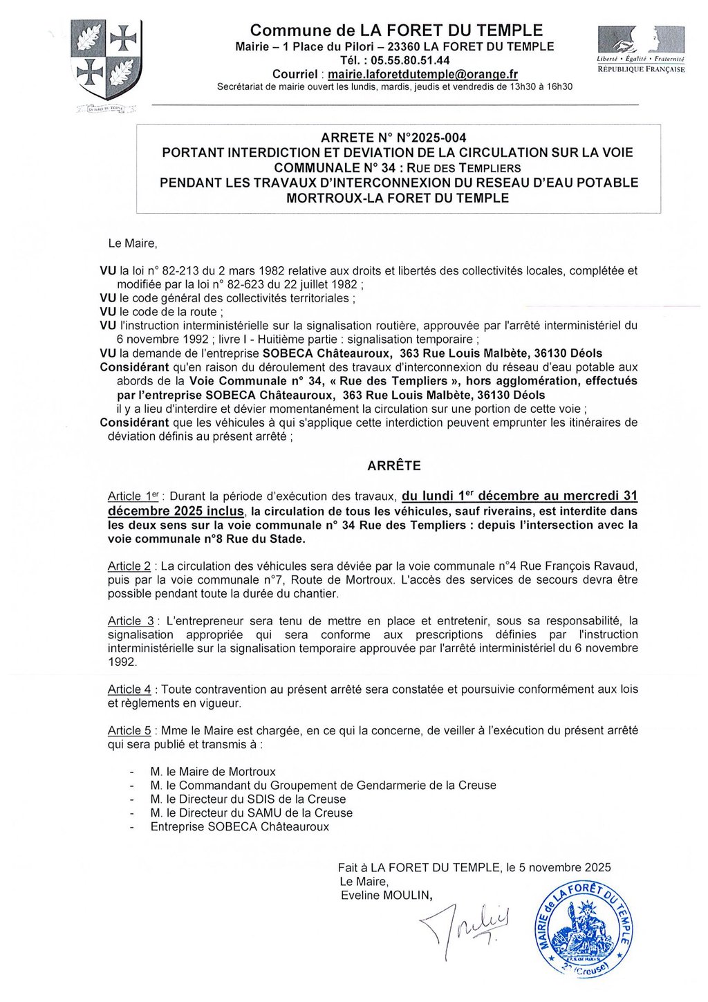 la circulation de tous les véhicules, sauf riverains et services de secours, sera interdite et déviée du 1er au 31/12/2025.
