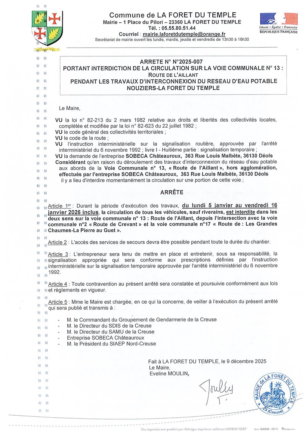 En raison des travaux d'interconnexion du réseau d’alimentation en eau potable entre la commune de Nouziers et celle de La Forêt du Temple, planifiés par le Syndicat d'Alimentation en Eau Potable Nord Creuse, dont le siège est basé à Linard-Malval,