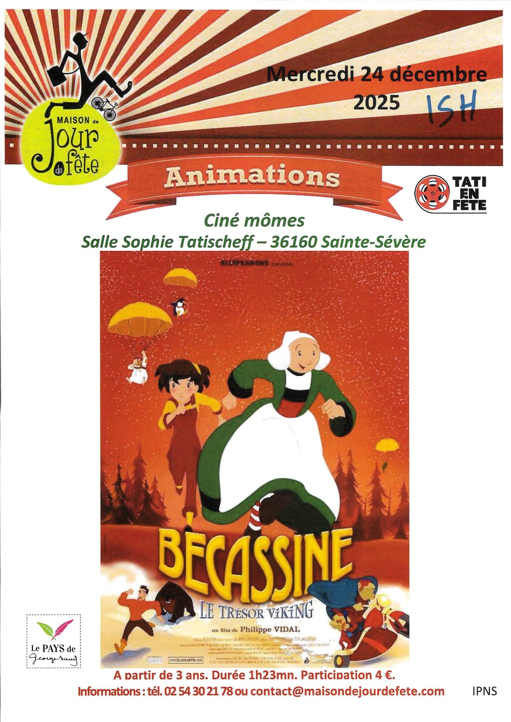 Animation de la Maison de Jour de Fête, projection Ciné-mômes, à 15h, salle Sophie Tatischeff