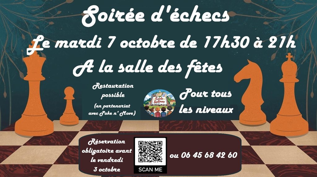 "L'école Salinae vous invite à une soirée d'échecs le mardi 7 octobre de 17h30 à 21h à la salle des fêtes de Castellane.