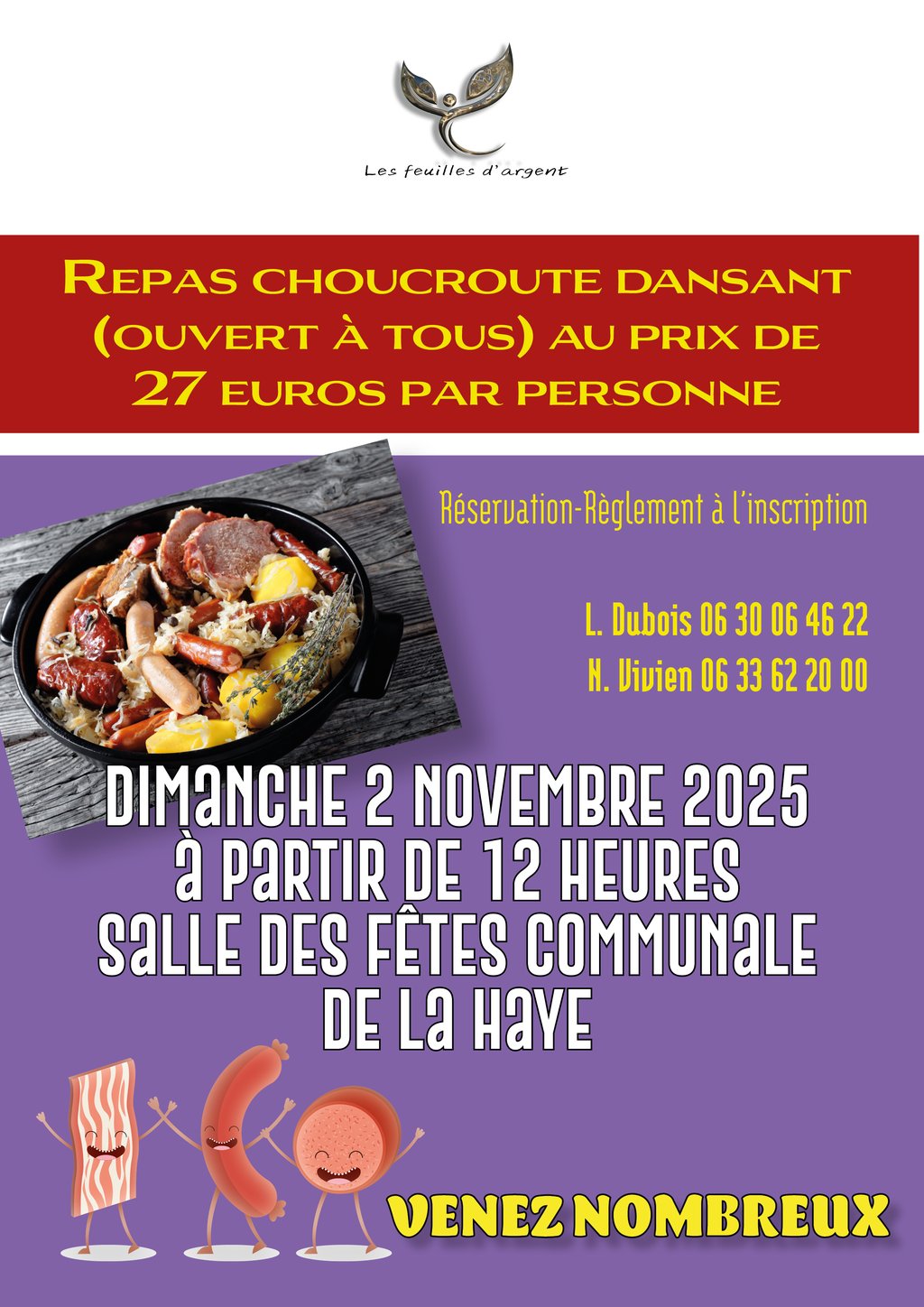L'automne sera festif à La Haye ! La dynamique association "Les feuilles d'argent" a le plaisir de convier tous les habitants de la commune et des environs à son traditionnel et chaleureux repas choucroute dansant.