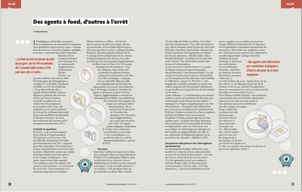 L'esprit d'innovation de notre commune est de nouveau mis à l'honneur ! Un récent article de "La Lettre du cadre territorial" a souligné l'expérimentation que nous menons sur l'intelligence artificielle (IA) pour moderniser nos services. Cette initiative, loin d'être isolée, est directement portée par notre Maire, Jean-Marc Gaillon, qui s'est engagé à faire de notre territoire un acteur de la transition numérique.