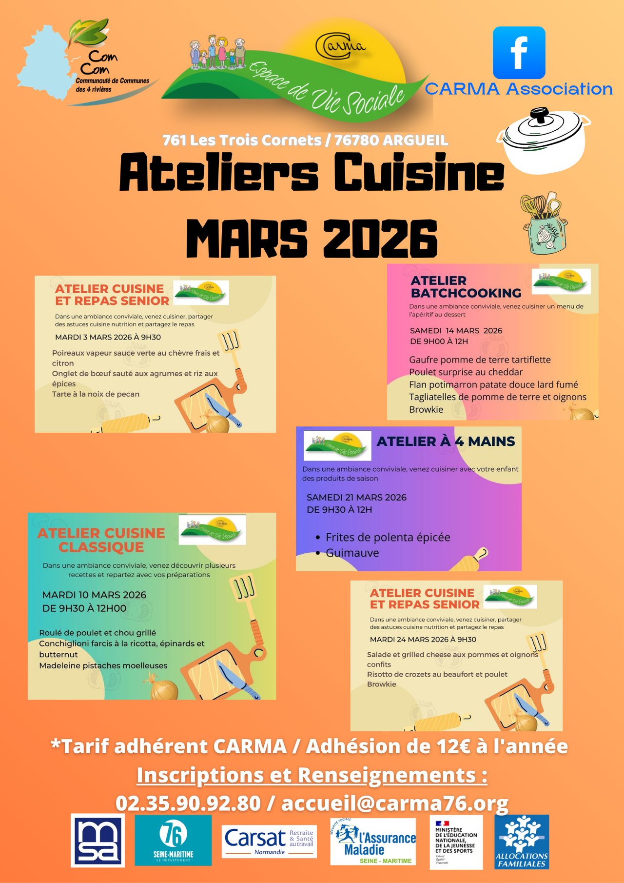 L’association CARMA, basée à Argueil (76780), vous invite à participer à ses ateliers en mars 2026. Que vous soyez senior, parent ou amateur de cuisine, ces rencontres sont conçues pour apprendre, créer et déguster dans une ambiance chaleureuse.