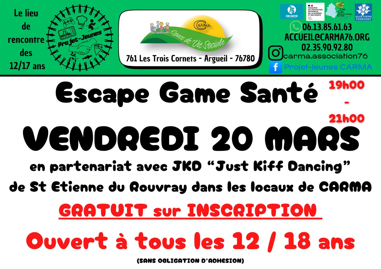 - Vendredi 20 mars | 19h : Escape Game Santé (gratuit, ouvert aux 12–18 ans, sans adhésion).