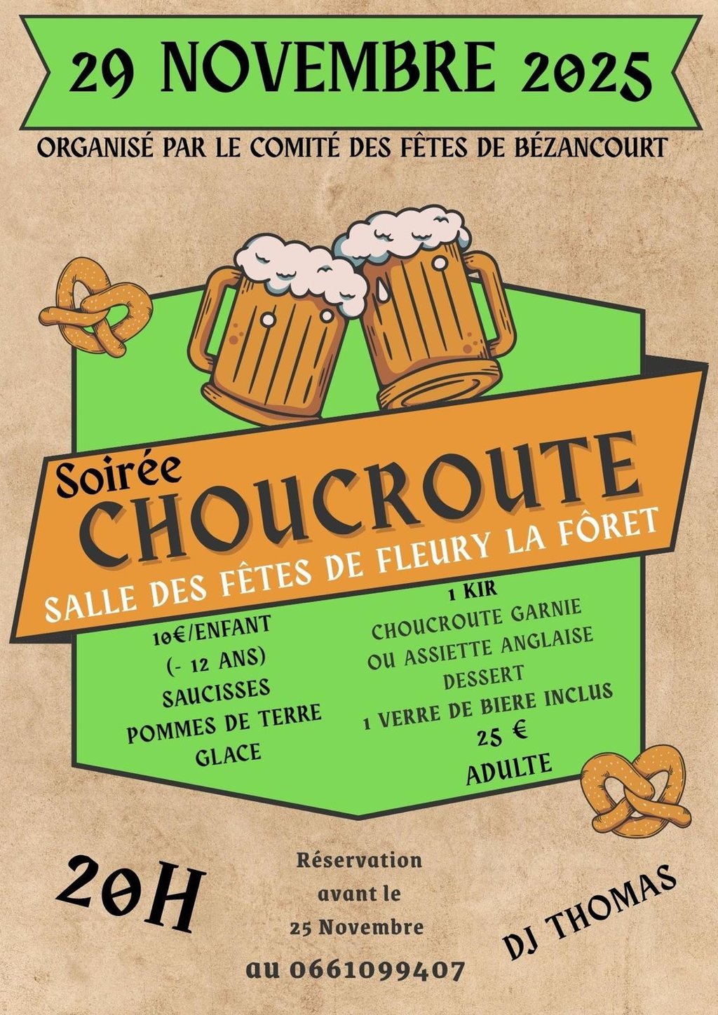 Le Comité des Fêtes vous informe de la traditionnelle Soirée Choucroute qui aura lieu à la salle des fêtes de Fleury-la-Forêt le 29 novembre 2025.